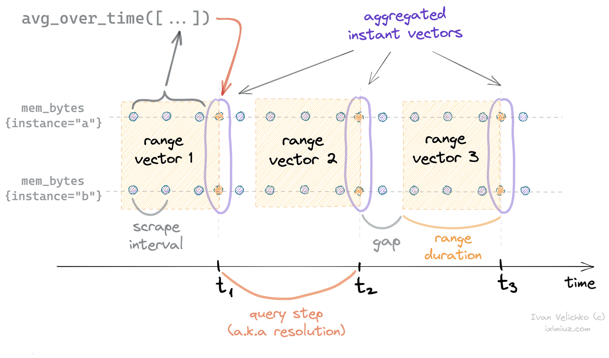 Unlike scalar elements of an instant vector, each element of the range vector is actually an array. Elements of such an array are scrape values falling into the corresponding time bucket. By applying an <agg>_over_time function to these buckets, we achieve a moving window effect that potentially can incorporate all data points without leaving any gaps. If the window duration is at least one resolution step long, none of the available data points will be discarded.