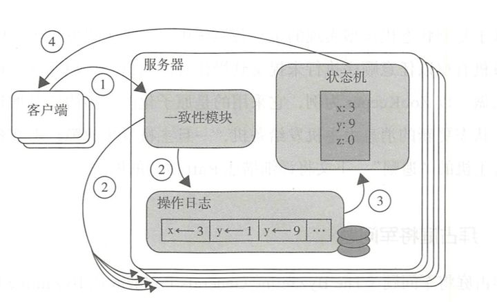 服务器上的一致性模块负责接收外部命令,然后追加到自己的操作日志中。它与其他服务器上的一致性模块进行通信以保证每一个服务器上的操作日志最终都以相同的顺序包含相同的指令。一旦指令被正确复制,那么每一个服务器的状态机都将按照操作日志的顺序来处理它们,然后将输出结果返回给客户端。